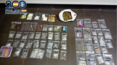 En un registro, la policía ha decomisado 215 gramos de marihuana, más de 170 gramos de hachís, 27 cigarros tipo porro, utensilios necesarios para el consumo y casi 3.000 euros en metálico.