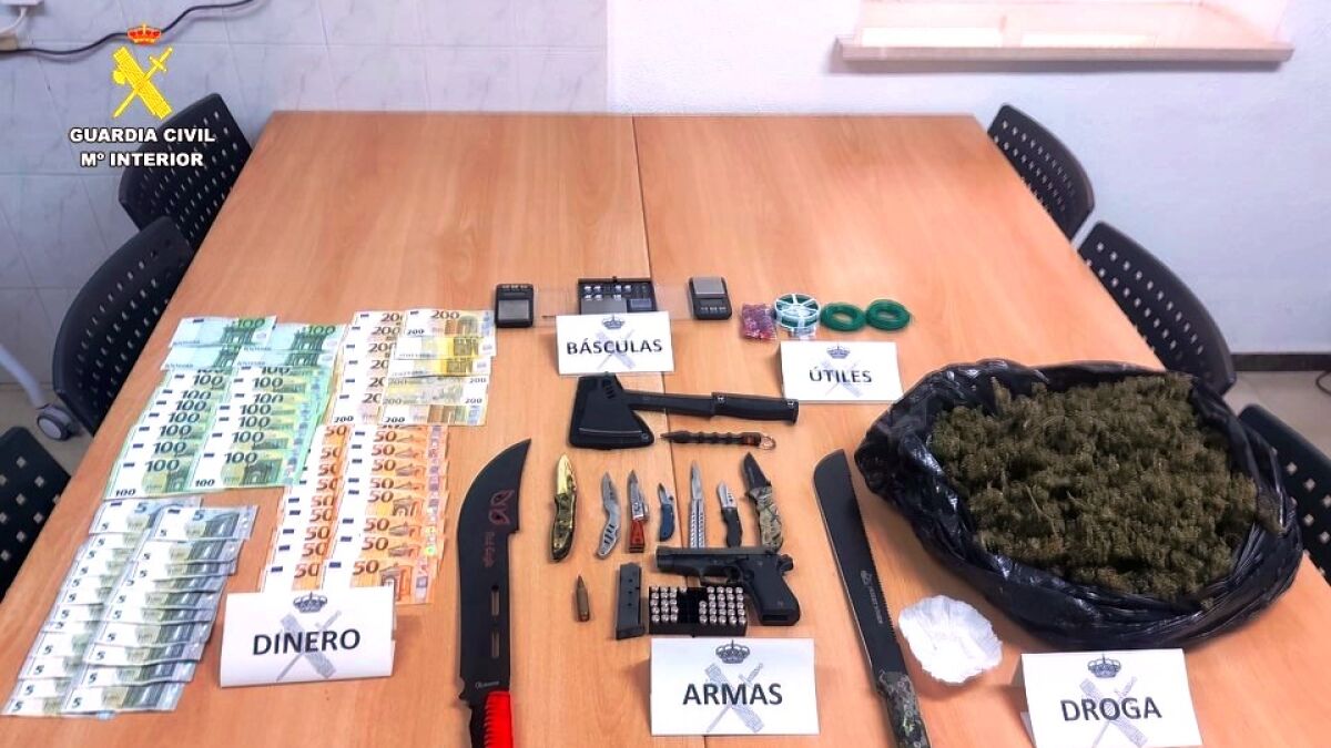 Fruto de los registros, se intervinieron 720 gramos de marihuana, 3 gramos de cocaína, efectos para el pesaje, corte y manipulación de la droga, 5.300 euros y diversas armas blancas y una pistola. Además, se identificaron a dos trabajadores en el lavadero, los cuales no tenían conocimiento de la actividad ilícita que estaba realizando su jefe.