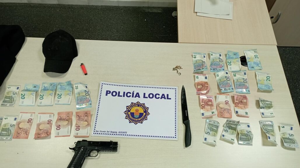 Con los datos aportados por la víctima, los policías locales dieron alcance a los presuntos autores, que coincidían con las características aportadas por el testigo. Procedieron a la detención en primera instancia de un varón de 56 años que portaba una pistola, al parecer simulada, y dinero en efectivo.