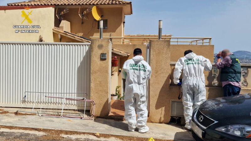 De manera inmediata, se desplazaron patrullas de la Guardia Civil y de la Policía Local de Calpe al lugar indicado. En una primera vivienda se halló el cuerpo sin vida de un varón español de 32 años, mientras que en una vivienda colindante fue descubierto el cuerpo de otro varón francés de 45 años, ambos cuerpos presentaban heridas de armas de fuego. En este último domicilio se halló un arma corta.