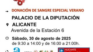 El Centro de Transfusión de la Comunitat Valenciana (CTCV), en colaboración con la Diputación de Alicante, organiza este sábado 30 de agosto un Maratón de Donación de Sangre en el Palacio Provincial. Esta jornada solidaria se desarrollará en horario de 09:30 a 14:00 horas y de 16:00 a 21:00 horas con el objetivo de reforzar las reservas de sangre, que tienden a descender en verano.