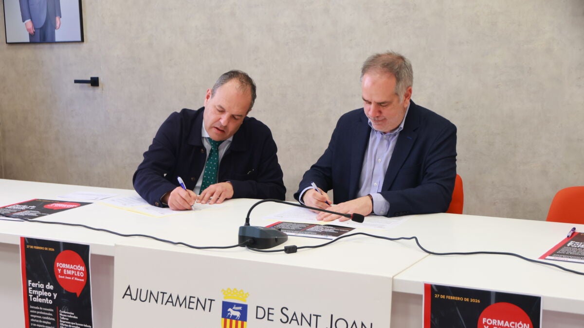 El alcalde de Sant Joan d’Alacant, Santiago Román y el presidente de la Cámara de Comercio de Alicante, Carlos Baño, han presentado hoy las acciones formativas que se van a impulsar en próximas fechas a raíz del convenio firmado entre ambas instituciones para la colaboración mutua en la realización de los programas Talento Joven y Talento +45 en el municipio de Sant Joan d’Alacant. Al acto también ha asistido la concejala de Desarrollo Económico y Empleo, Charo Tomás.