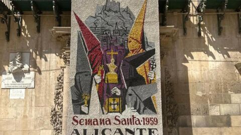 La Semana Santa llega a las puertas del Ayuntamiento de Alicante con la instalación de dos tapices florales que reproducen, desde este jueves, los carteles anunciadores de la Semana de Pasión de 2026 y 1959. El primero de ellos, original del malagueño Rafael Laureano Martínez, representa la imagen de la Santa Mujer Verónica, original de Antonio Castillo Lastrucci, perteneciente a la Real Hermandad Sacramental del Santísimo Cristo de las Penas y Santa Mujer Verónica, que procesiona en la matinal del Domingo de Ramos.