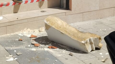 La pieza de grandes dimensiones se ha desprendido del balcón de una vivienda situada en la parte superior de un comercio, por lo que ha sido una gran suerte que en ese momento ninguna persona entrara o saliera del establecimiento.