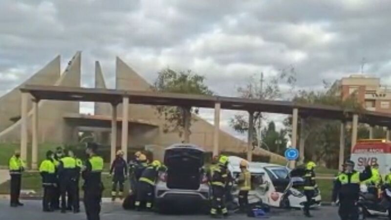 Aparatoso accidente de tráfico entre tres coches, uno de ellos un taxi, con tres heridos esta mañana en la rotonda de la avenida Jaime I con la calle Teulada.