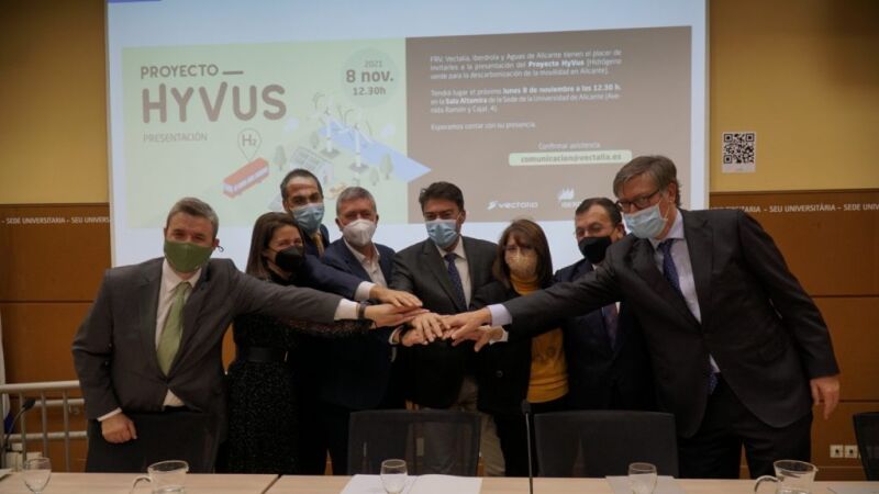 La Sede Universitaria Ciudad de Alicante ha acogido esta mañana la firma del consorcio del proyecto HyVus, una iniciativa conjunta de Vectalia, Fotowatio Renewable Ventures (FRV), Iberdrola y Aguas de Alicante para el impulso del hidrógeno verde en Alicante. Las cuatro empresas se unen para optar a las ayudas de los fondos Next Generation con el objetivo de desarrollar un modelo de movilidad “cada vez más responsable, sostenible y respetuoso con el medioambiente; mediante la producción y el uso de hidrógeno verde como combustible”, según han destacado los promotores en nota de prensa.