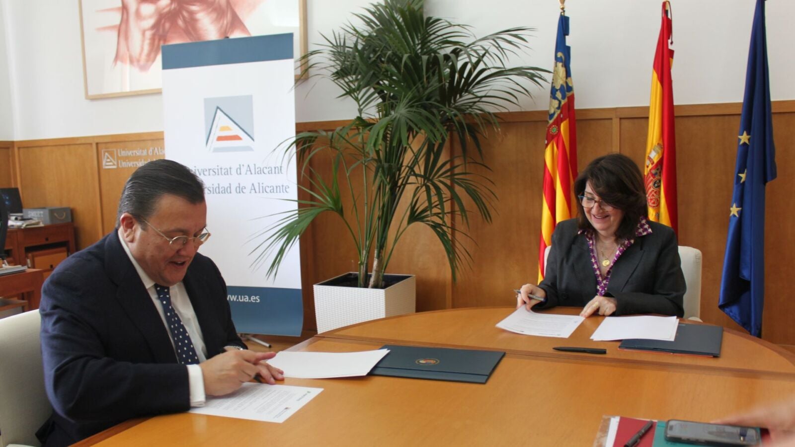 La rectora de la Universidad de Alicante, Amparo Navarro, y el presidente de Vectalia, Antonio Arias, han renovado, un año más, el convenio de colaboración vigente entre ambas instituciones. El acuerdo afianza el compromiso de mecenazgo de Vectalia para los grupos de cámara de la Orquesta Filarmónica de la Universidad de Alicante (OFUA), concretamente, para el cuarteto de cuerda Vibrato String Quartet UA y para el quinteto de metales Maestoso Brass Ensemble. Rectora y presidente han estado acompañados por la vicerrectora de Cultura, Deporte y Extensión Universitaria, Catalina Iliescu, la directora de la Fundación General de la UA, Lucía Gómis, y la técnica del aula de música, Loretta González.