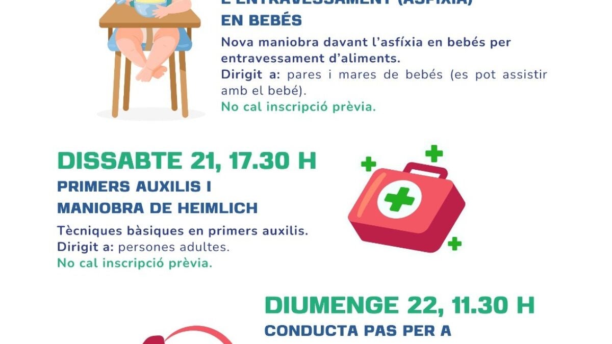 Ese mismo sábado, a las 17.30 h, se desarrollará un segundo curso orientado a personas adultas, en el que se explicarán técnicas básicas de primeros auxilios, como la maniobra de Heimlich.