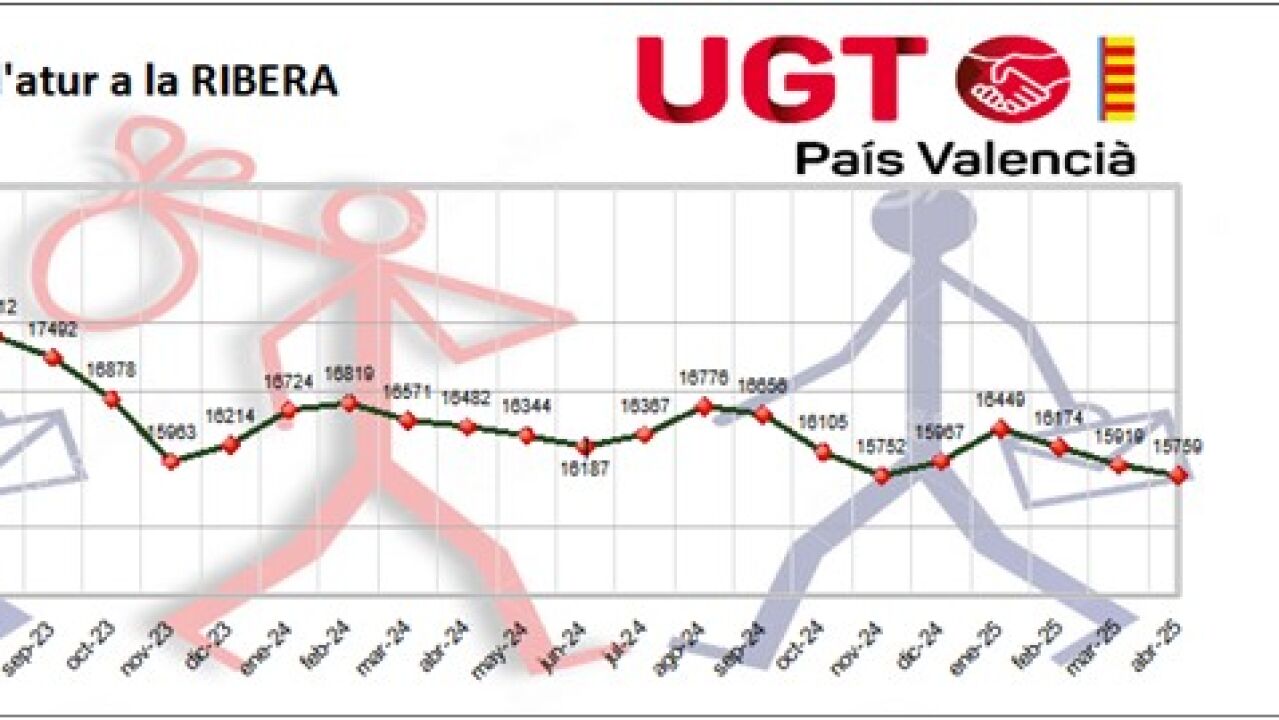 Según las cifras publicadas por el SERVEF, el paro registrado en el mes de abril en la Ribera, se ha situado en 15759 personas, es decir, 160 parados menos que en el mes de marzo, con un descenso mensual del 1’01%.