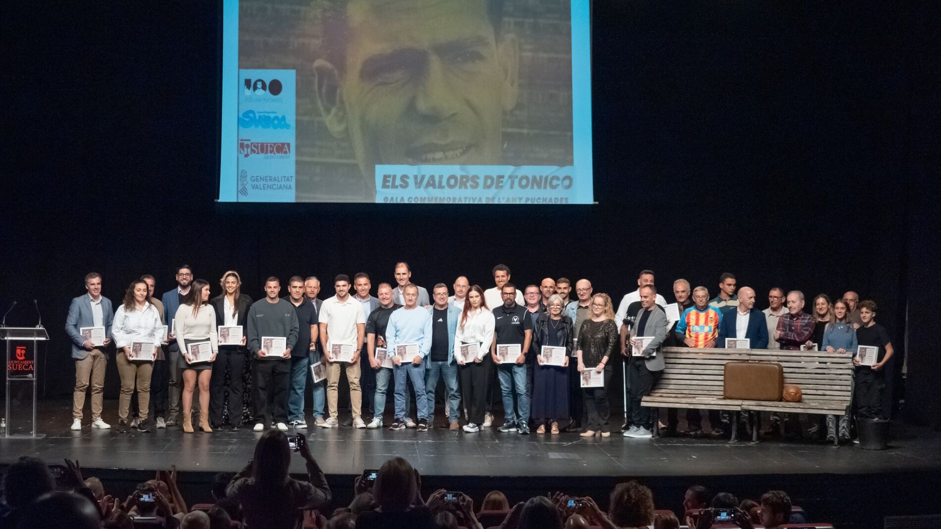 El acto, uno de los más significativos programados dentro del ‘Año Puchades’, que en este 2025 está conmemorando el centenario de su nacimiento, contó con la presencia de varios familiares del futbolista, entre ellos sus sobrinas Paz, Elo y Pili Puchades; el alcalde de Sueca con delegación de Deportes, Julián Sáez; el director general de Deportes, Luis Cervera; una gran representación de la corporación municipal; el hijo predilecto de Sueca, Vicent González; así como una amplia representación del asociacionismo deportivo de la ciudad, quienes fueron los encargados de determinar a los y las deportistas merecedores de los reconocimientos de la velada por representar los valores de los que hizo gala Antonio Puchades en vida.
