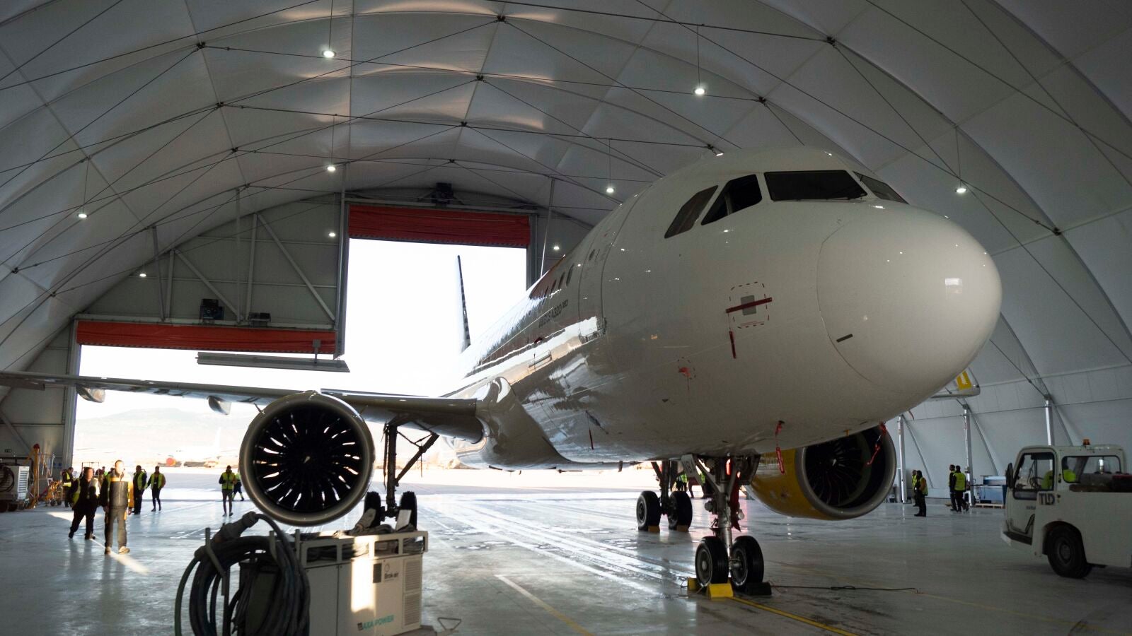 El hangar, que ha supuesto una inversión por parte de la empresa de 2,2 millones de euros entre infraestructura y equipamientos, abarca una superficie de 2.500 metros cuadrados y tiene una altura de 18 metros.