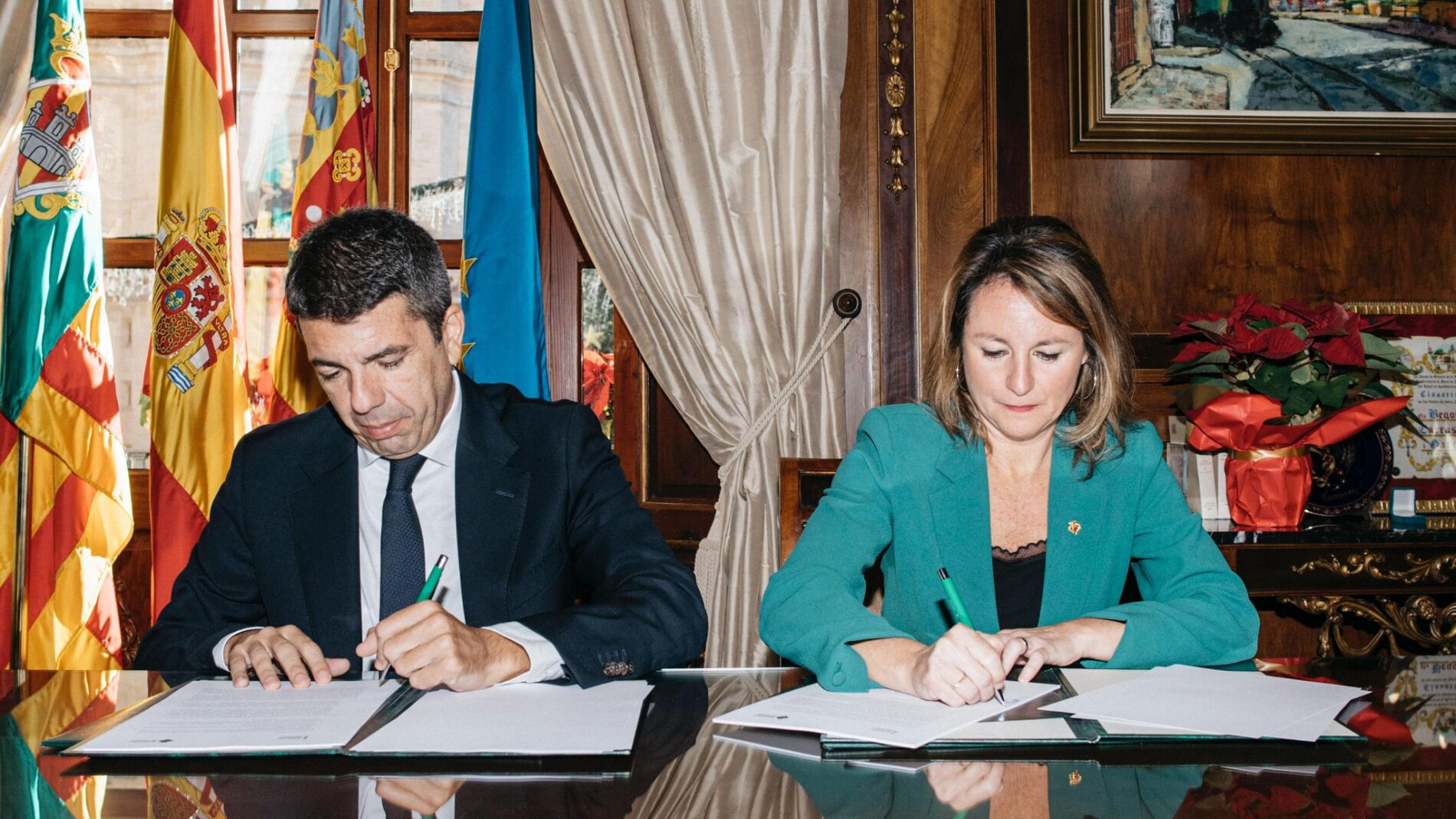 El president de la Generalitat Valenciana, Carlos Mazón, ha firmado con la alcaldesa de Castellón, Begoña Carrasco, el convenio para la ejecución de las obras de finalización de la Ronda Oeste y el convenio para la apertura del Edificio Borull, antigua sede judicial de la ciudad.