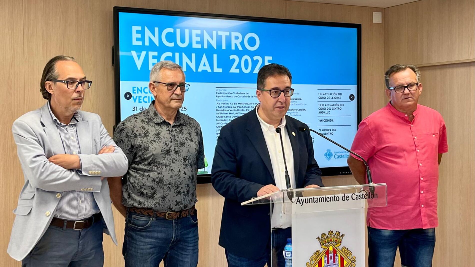 Paco Cabañero, concejal del área, ha presentado en rueda de prensa esta jornada que tendrá lugar el próximo sábado 31 de mayo en el Palau de la Festa. Y lo ha hecho acompañado de Pedro Bermúdez, presidente de la Asociación Vecinal Grupo Reyes- Crta. Alcora y de la federación vecinal COASVECA; Pablo Ibáñez, de la Asociación de Vecinos Venta Nova y Vicente Mateu, presidente de la Asociación Vecinal Els Mestrets.