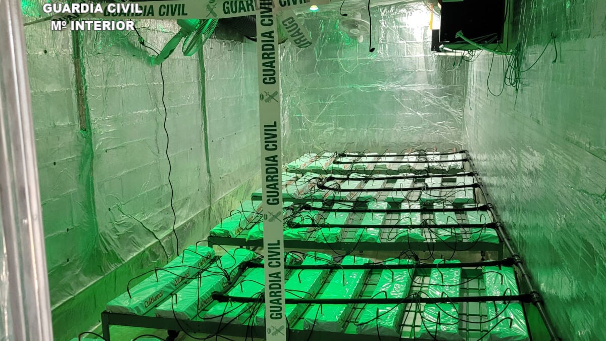 La desarticulación ha sido fruto de las investigaciones y vigilancia de la Guardia Civil que culminó con una entrada y registro en el interior del inmueble y un anexo a la vivienda. Allí encontró más de medio kilogramo de cogollos de marihuana, medios y elementos necesarios para su cultivo, fertilizantes para acelerar y potenciar el proceso de floración y maduración de las plantas, lámparas halógenas, humidificadores extractores y un novedoso sistema de riego por goteo. Tras unos palets de madera ocultos los agentes localizaron un sofisticado sistema de enganche ilegal de fluido eléctrico que estaba escondido por debajo del subsuelo de la vivienda. La vivienda contaba con un sistema de video vigilancia preparado para poder visionar los vehículos y personas que se aproximaban al domicilio.