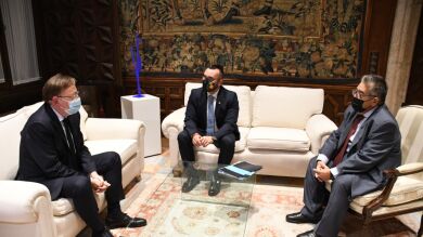 L'alcalde de Vila-real, José Benlloch, i el director de la Càtedra d'Innovació Ceràmica Ciutat de Vila-real, Juan Carda, han sigut rebuts, en representació del comité tècnic de la fira, pel president de la Generalitat, Ximo Puig, com a mostra del suport de l'Executiu autonòmic a Destaca 2020.