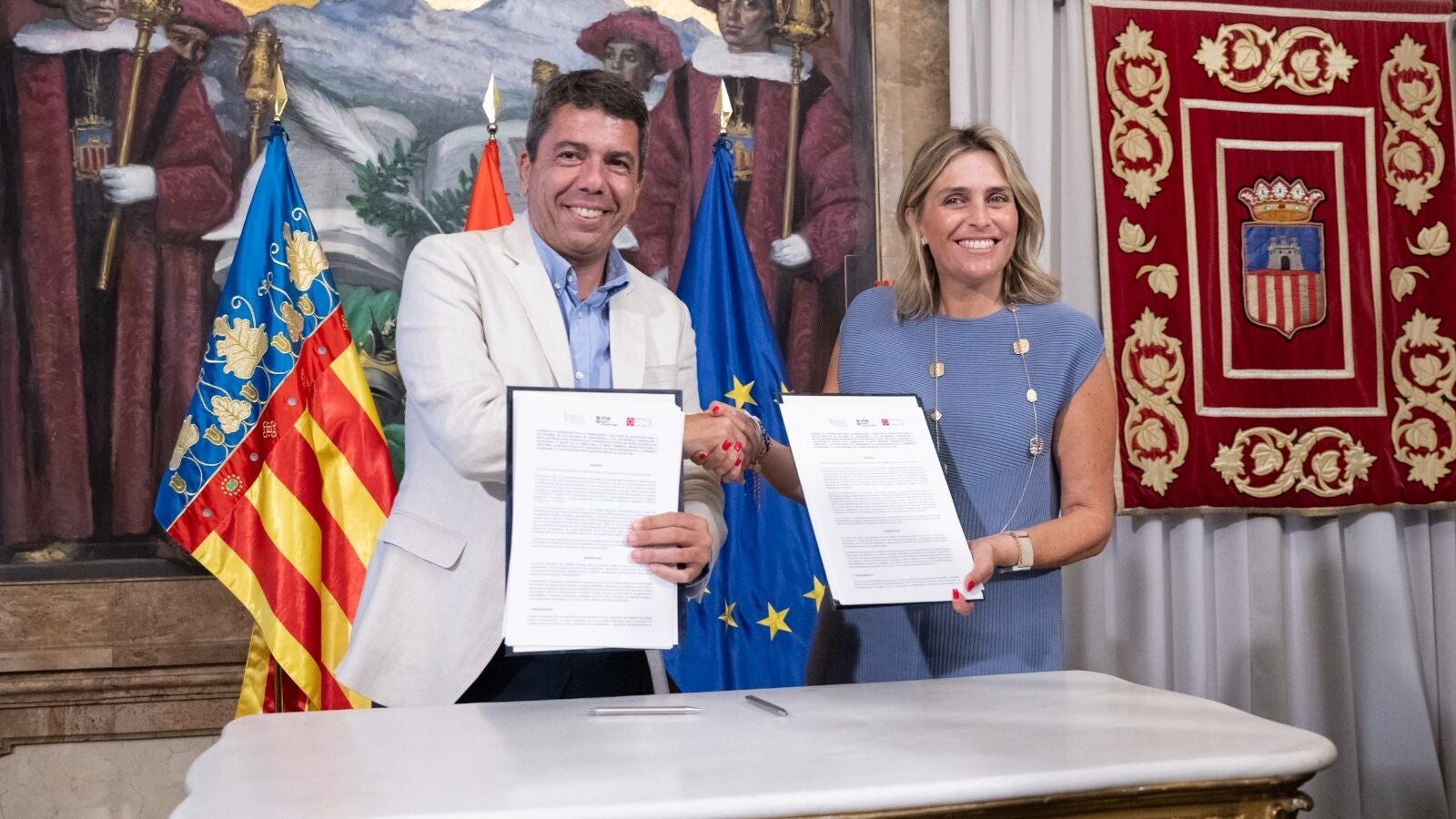 El Salón de Recepciones del Palacio Provincial ha sido el escenario en el que se ha llevado a cabo la firma del convenio entre la Diputación Provincial de Castellón y la Generalitat Valenciana a través de la Entidad Pública de Saneamiento de Aguas Residuales de la Comunitat Valenciana (EPSAR). Un acuerdo formalizado por la presidenta de la institución provincial, Marta Barrachina, y el president del Consell, Carlos Mazón, y a través del mismo se establece la hoja de ruta de los próximos cuatro años en cuanto a actuaciones para mejorar la depuración de aguas en municipios de hasta 5.000 habitantes.