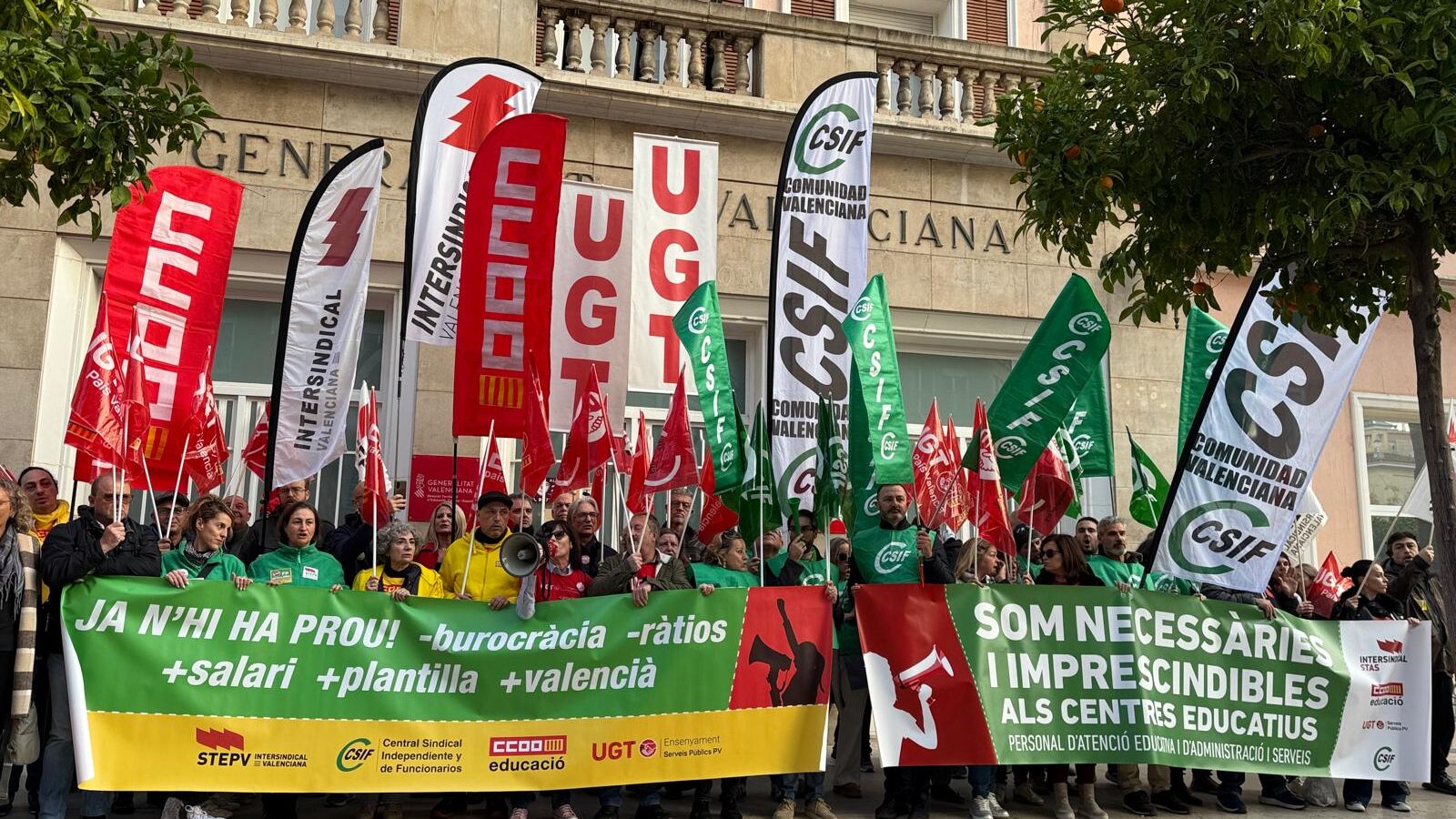 Los sindicatos han exigido asimismo “la recuperación del profesorado recortado” tras la aplicación de la nueva orden de plantillas que, según destacan, ha sustituido los acuerdos firmados en 2023. Reclaman también restituir la dotación presupuestaria “de 121 millones de euros” recortada en infraestructuras educativas y en el Pla Edificant, y denuncian la “dejadeza” del Consell en la rehabilitación de centros afectados por la DANA.