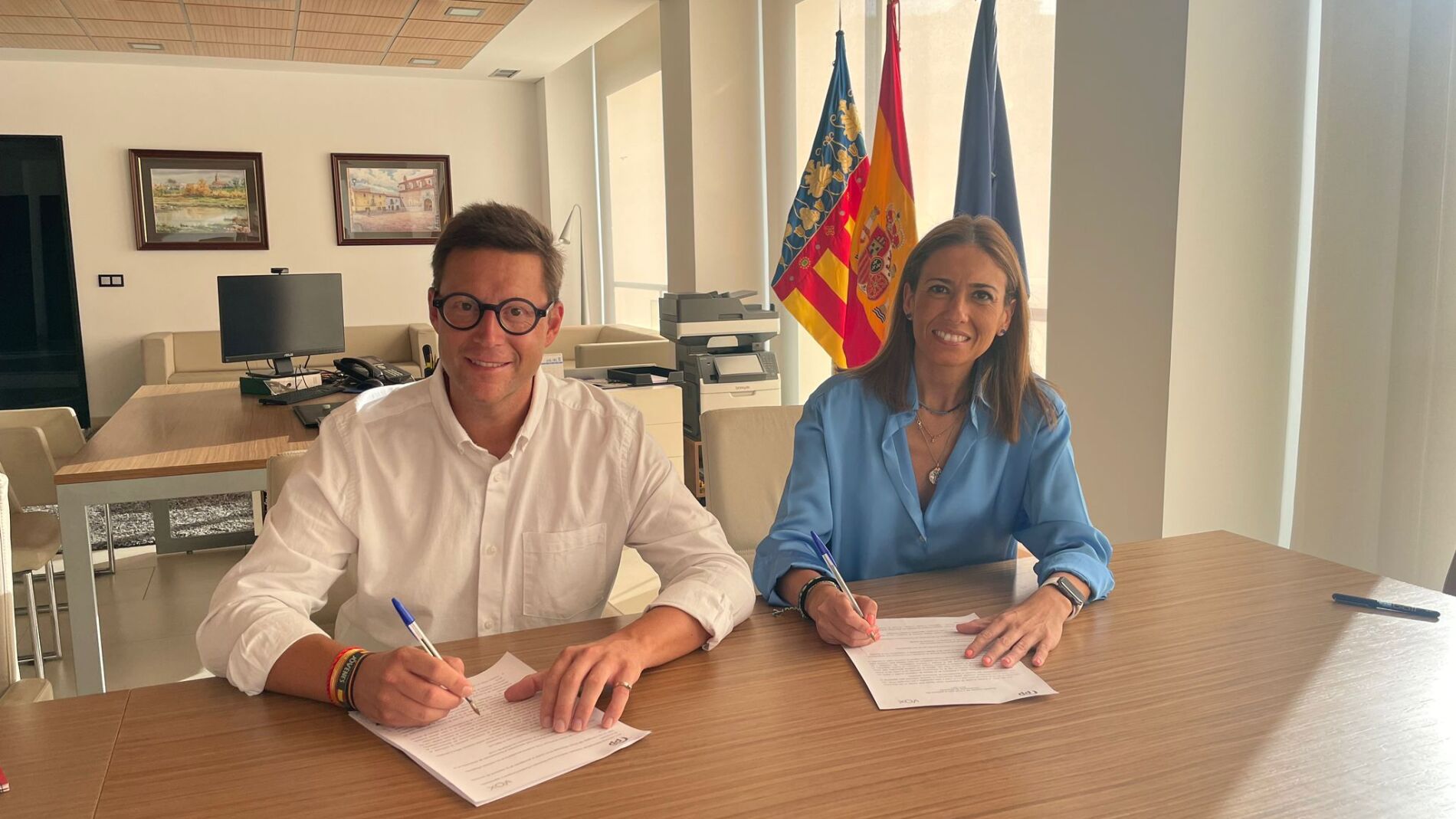 PP y Vox alcanzan en Almassora un acuerdo. El texto suscrito entre ambas formaciones políticas garantiza al PP la alcaldía y las tenencias de alcaldía, que son siete asignadas a los concejales del PP. Por su parte, los tres ediles de Vox asumirán competencias como regidores.