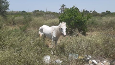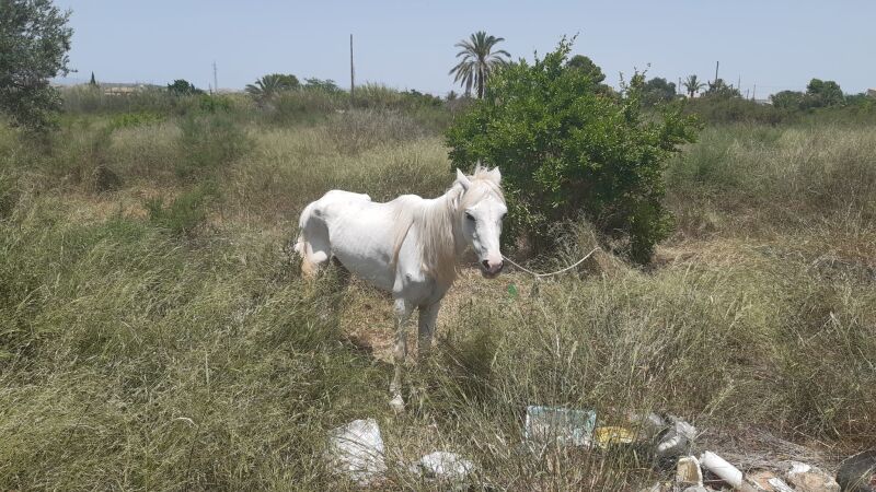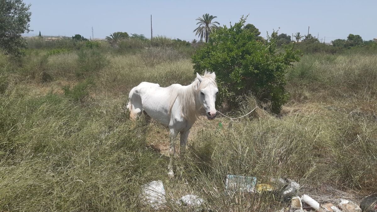 Hace un par de semanas, la Policía Local y los vecinos alertaron en Elche de la presencia de una yegua abandonada en un descampado por la zona del Kelme en plena ola de calor. La Asociación Alma Hondón acudió al lugar y los voluntarios encontraron al animal en un estado de desnutrición.