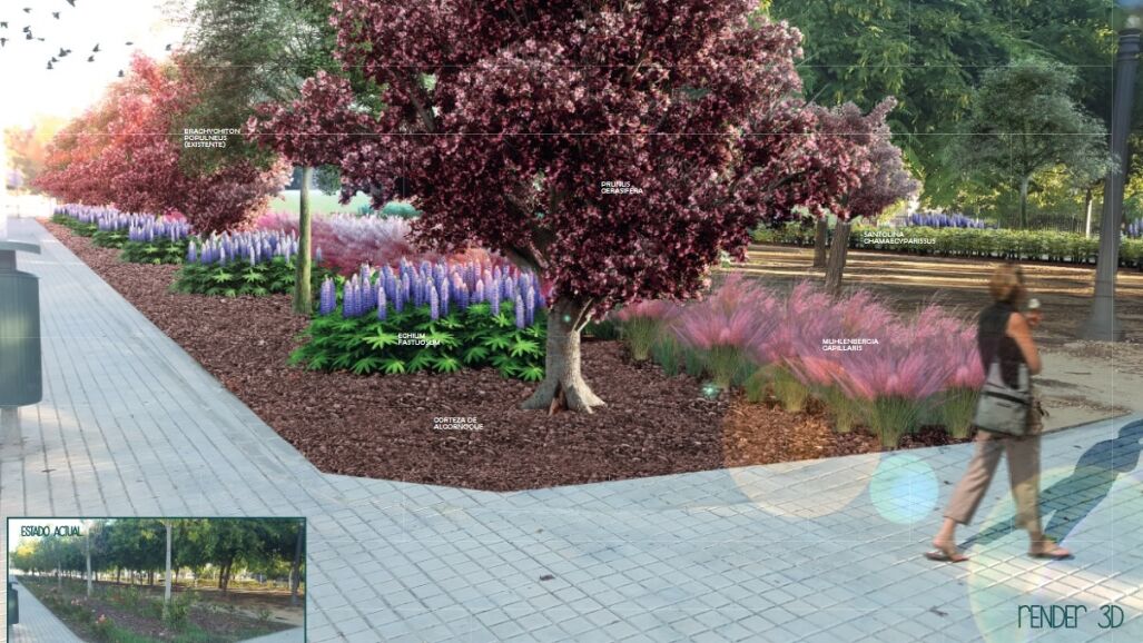 En relación con los árboles y arbustos que se plantarán, serán "especies autóctonas" como naranjos o los drunus. Además, se implementarán bordillos de hormigón y acero para acotar los parterres que contiene el bulevar.
