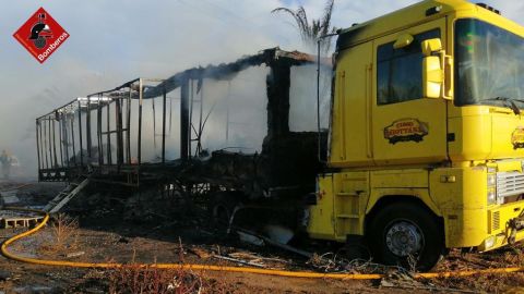 Efectivos del parque principal de bomberos del área operativa de Elche han sofocado en la tarde de este lunes el incendio originado en un camión con remolque de vivienda de los usados por feriantes y circos que se encontraba en una parcela privada ubicado entre las pedanías de Las Bayas y Asprillas. El remolque que albergaba la vivienda ha quedado totalmente calcinado, mientras que la cabina, transmisión y motor del vehículo pesado han quedado gravemente afectados.