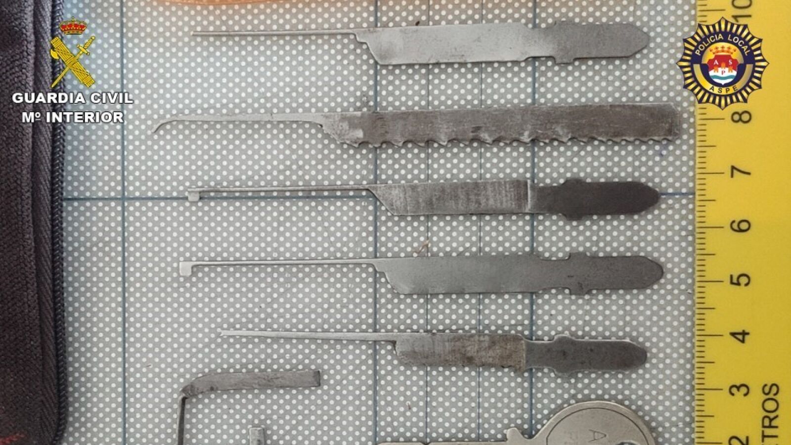 Los agentes han intervenido un juego de ganzúas artesanal, que puede utilizarse para manipular las cerraduras de puertas, en la repisa exterior de una de las ventanas de la comunidad de vecinos y tras realizar un análisis han comprobado que los presuntos delincuentes los habían fabricado a partir de hojas de sierra de calar para abrir puertas.