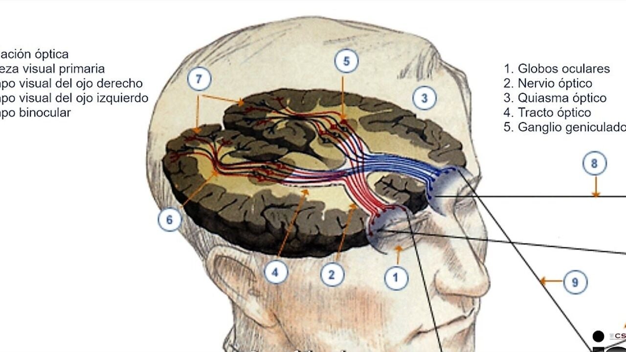 Los axones de las neuronas situadas en la zona de la retina más cercana a la nariz cruzan la línea media por el quiasma óptico, proyectando en el hemisferio opuesto, mientras que el resto de axones evita la línea media a nivel del quiasma óptico para proyectar al mismo lado del cerebro del que parten.