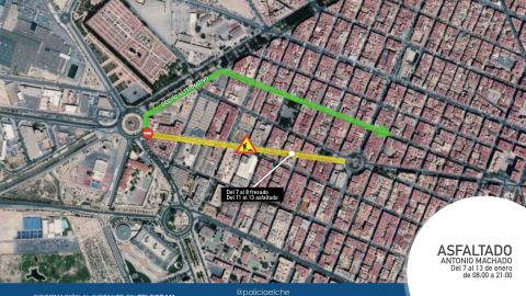 Este jueves han comenzado en Elche los trabajos de asfaltado del tramo de la calle Antonio Machado que discurre entre la rotonda de L’Aljub de la avenida de la Libertad y la Plaza de Crevillente.