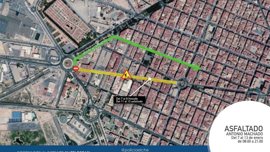 Desde el área de Tráfico de la Policía Local de Elche se recomienda como itinerarios alternativos circular desde la rotonda de L’Aljub en dirección a la avenida de la Libertad y desde ahí dirigirse a la calle Mariano Benlliure o desde la rotonda de L’Aljub tomar el sentido de circulación hacia la calle Pedro Juan Perpiñán o la avenida Alcalde Ramón Pastor.