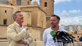 El alcalde de Elche, Pablo Ruz, y el conseller de Infraestructuras y Territorio, Vicente Martínez, señalan el plan de inversiones de 123 millones de euros de la Generalitat para el municipio. Este dinero estará destinado a diferentes actuaciones como son el tramo de Elche a Santa Pola, la construcción del TRAM y de la depuradora.