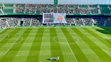 El tifo mostrado en el Martínez Valero, con el sello de la diseñadora gráfica del club Sonia Arcos, ha mostrado en el lado derecho el escudo en color del club y en la otra parte el mensaje: “Juntos por tu escudo, un sentimiento eterno”. Más de 20 personas han sido las encargadas de dejar caer esta lona que se ha desplegado ante la grada inferior de Preferencia a la salida de los dos equipos. De esta manera, el entorno franjiverde ha recogido el guante lanzado por sus futbolistas, directivos, propietario y, sobre todo, su entrenador, Sebastián Beccacece, que siempre ha apelado a la unión para conseguir el “sueño” del ascenso a Primera División.