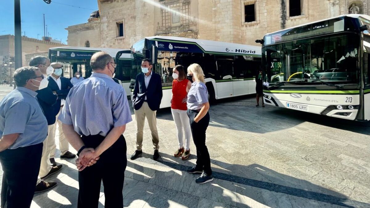 El alcalde de Elche, Carlos González, y la concejala de Movilidad Sostenible, Esther Díez, han presentado hoy los cinco nuevos autobuses híbridos que se incorporan a la flota del servicio de transporte público de Elche.