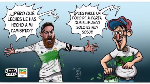 El equipo de Fran Escribá viaja cargado de optimismo a la capital de España, donde espera puntuar y plantar cara al Real Madrid. Así lo refleja en la viñeta de esta semana el artista José Antonio Belmonte, que le estampa la franja verde en el pecho al capitán blanco Sergio Ramos.