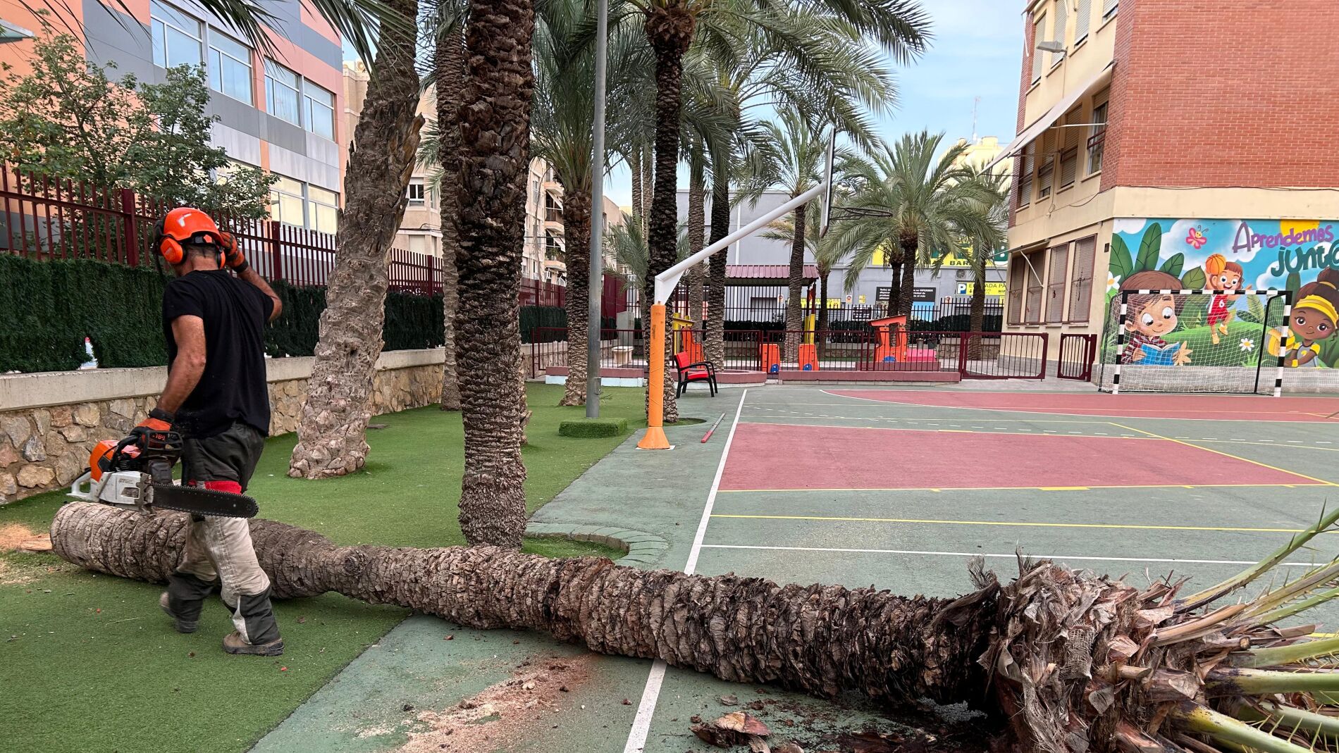 El Ayuntamiento de Elche estima que a mitad de la semana que viene habrán concluido los trabajos de tala de todas las palmeras y árboles que hay en centros educativos del municipio. Hasta el momento se han retirado 84 palmeras de 14 centros educativos, estando previsto que se eliminen un total de 93, así como 48 árboles de ocho de ellos.