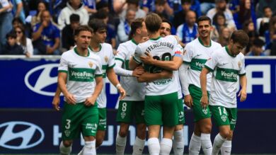 Los franjiverdes tienen cuatro puntos de margen sobre la zona roja. Si el Levante vence este lunes, la renta se reducirá a tres. En Oviedo llegó la primera victoria a domicilio del curso y el Elche se quitó un peso de encima. Ya no es el peor visitante de la categoría, puesto que ha superado al Mallorca.