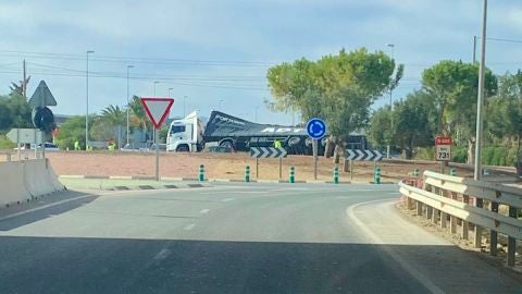 Las fuertes rachas de viento han provocado el vuelco de un tráiler en la rotonda de acceso de la Institución Ferial Alicantina (IFA) sin que haya habido que lamentar víctimas. El accidente ha tenido lugar este viernes, al mediodía, cuando las ráfagas de viento han comenzado a soplar con fuerza, con una velocidad en torno a los 80 kilómetros por hora.