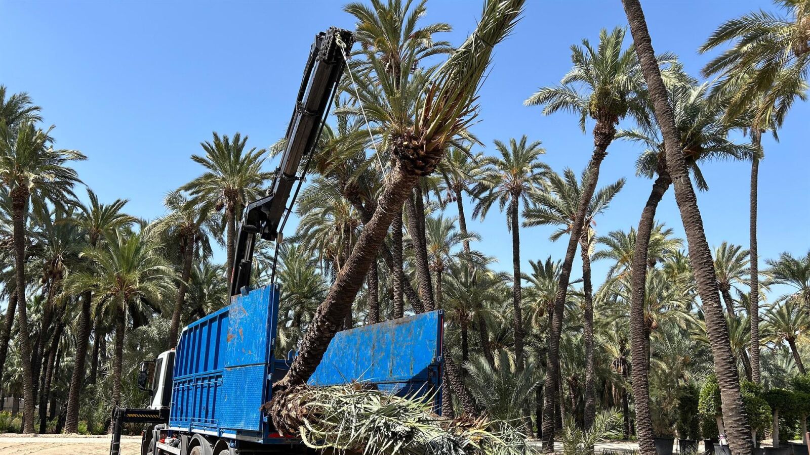 El Ayuntamiento de Elche ha comenzado este martes a trasplantar en el Huerto de La Molinera buena parte de las palmeras que han sido retiradas de la calle Pedro Juan Perpiñán después de que un informe técnico indicara que muchas de ellas tenían un riesgo "alto o muy alto" de desplomarse sobre la vía pública.
