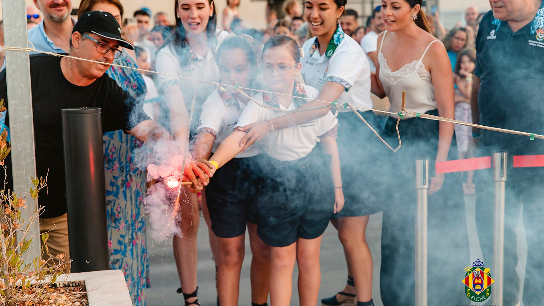 Las encargadas de encender la mecha fueron Caridad Martínez e Inma Mora, concejalas de Fiestas y Sanidad respectivamente; junto al Daniel Párraga ( gerente del centro) , Fernando Jaén (presidente de la Gestora de Festejos Populares) y las damas mayores e infantiles de Elche: Andrea Puentes, Carla Ferrándiz, Adriana Sánchez y Claudia Felipe.