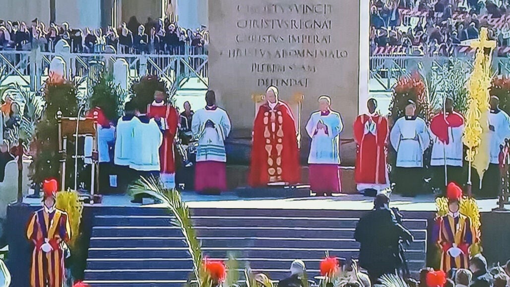 En su primera misa de Domingo de Ramos, el Papa León XIV ha estado acompañado (como se ve a la derecha de la imagen que ilustra esta noticia) de la gran y vistosa palma blanca trenzada por artesanos de Elche, que está rematada con una gran cruz.