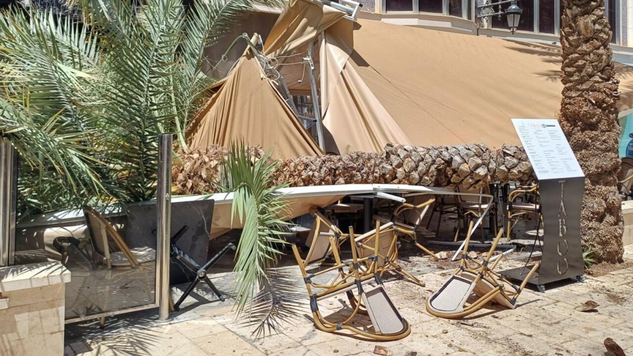 La tragedia ha sobrevolado este viernes la céntrica plaza Glorieta de Elche. Una de las palmeras que hay en esa zona se ha partido y su parte superior ha caído sobre la terraza de un establecimiento de hostelería. Afortunadamente, en la zona de ese espacio en la que se ha precipitado la palmera no había personas, de modo que no se tienen que lamentar daños personales.