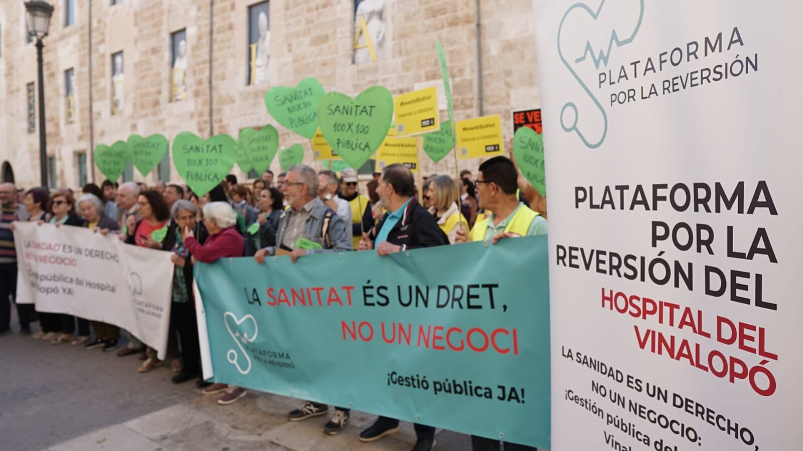 Integrantes de la Plataforma por la reversión del Hospital del Vinalopó se han concentrado este miércoles ante las puertas de Les Corts para exigir a la Generalitat Valenciana la reversión a la gestión pública de ese centro, que encabeza el departamento de salud Elx-Crevillent, que asistencialmente abraca parte de la ciudad de Elche y los municipios de Crevillent, Aspe, Hondón de los Frailes y Hondón de las Nieves, así como la pedanía Barbarroja de Orihuela.
