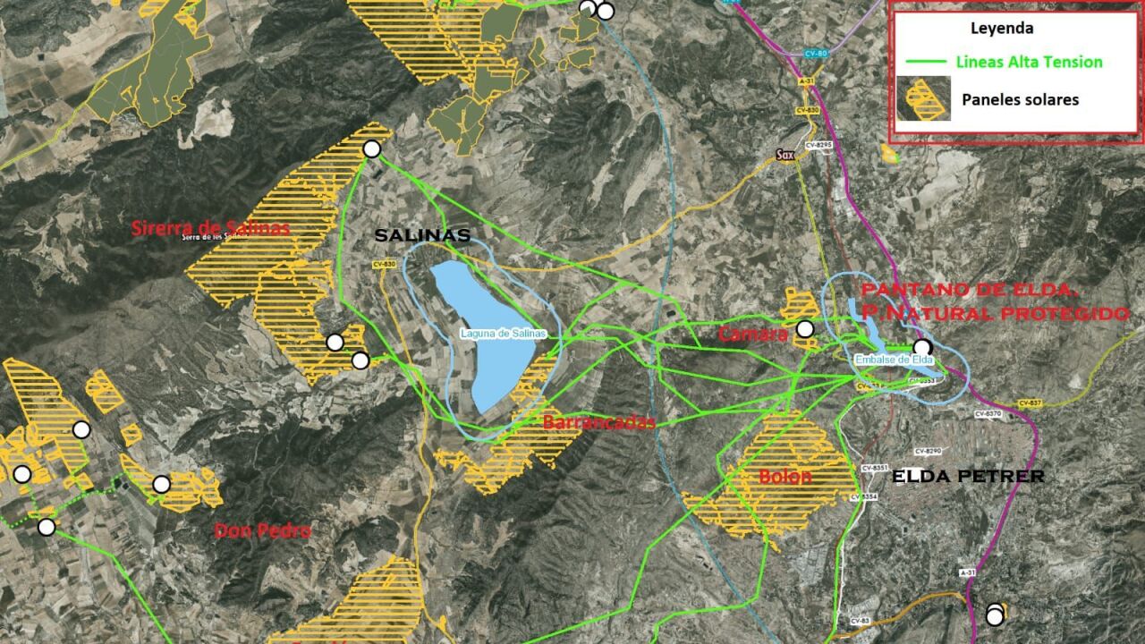 La plataforma denuncia, por ejemplo, que en Salinas hay en tramitación la llegada de tres plantas fotovoltaicas de grandes dimensiones que prevén ocupar 500 hectáreas de superficie, el equivalente a 450 campos de fútbol, en una localidad que tiene un término municipal con una superficie de 6700 hectáreas.