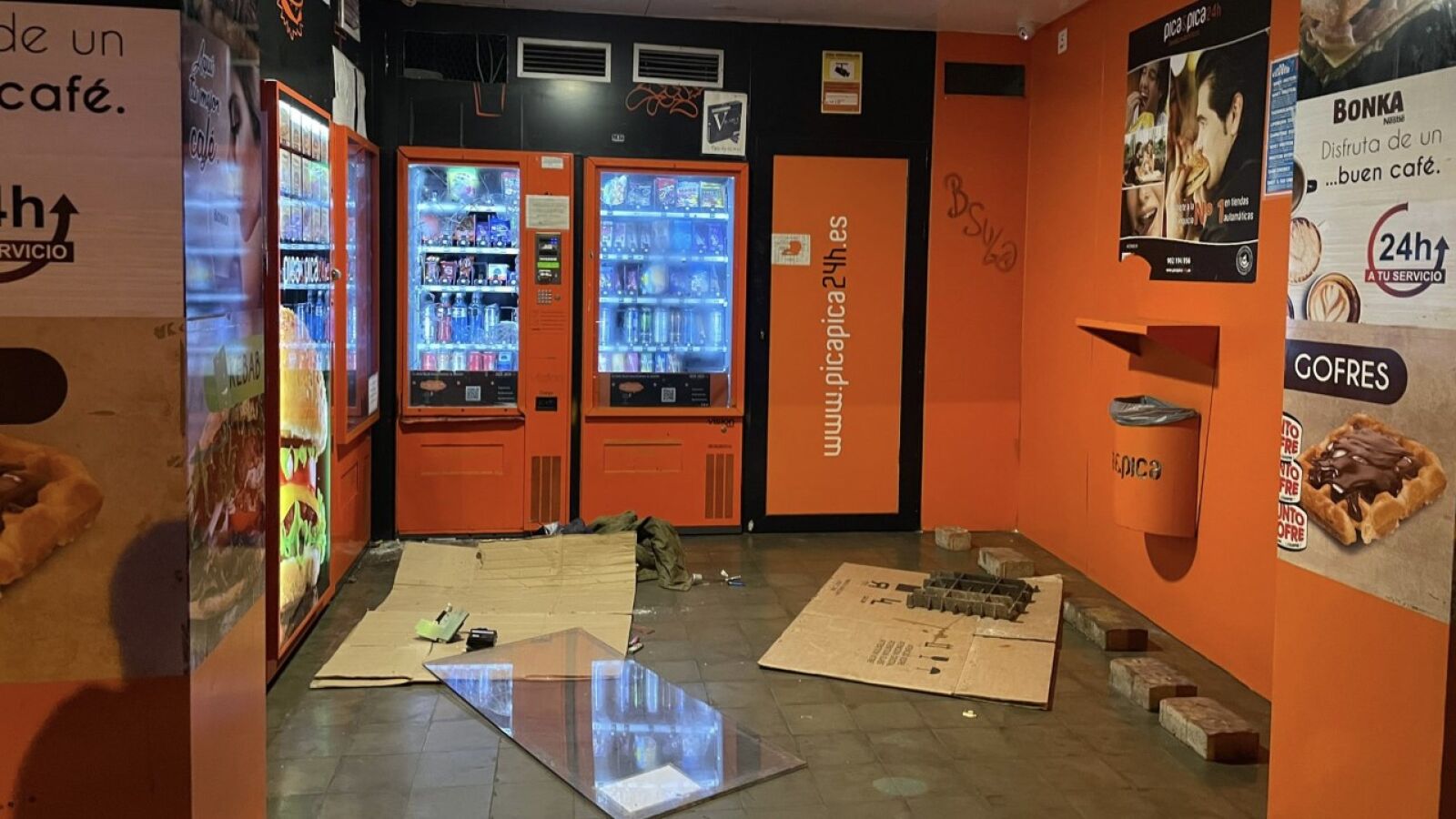 El detenido presentaba heridas sangrantes en los nudillos, al tiempo que los agentes de la Policía Local comprobaron en el establecimiento del que había salido el joven que una de las máquinas expendedoras tenía su cristal roto, quebrado probablemente con la reja de un imbornal, y su cajetín forzado.