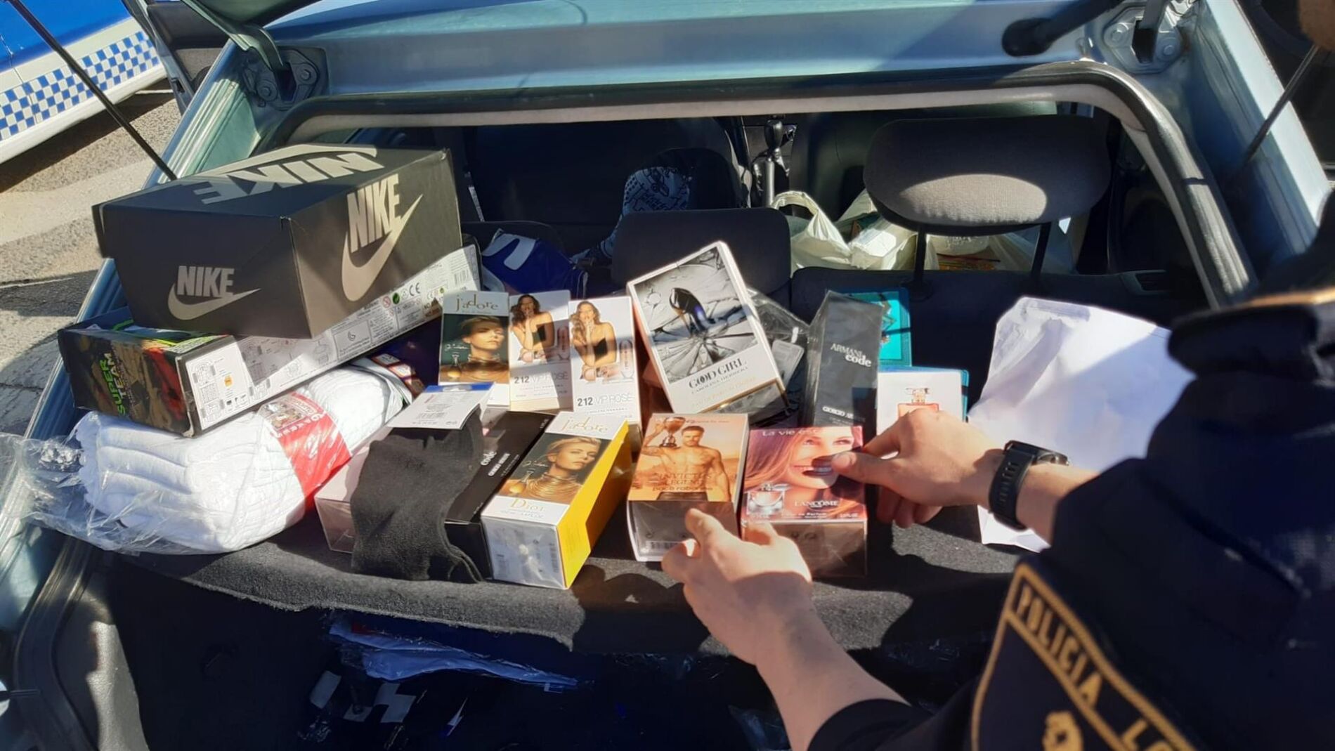 Agentes de la Policía Local de Elche han intervenido más de un centenar de prendas de vestir y colonias supuestamente falsas en el registro de un vehículo que realizó una maniobra evasiva al detectar un control policial.