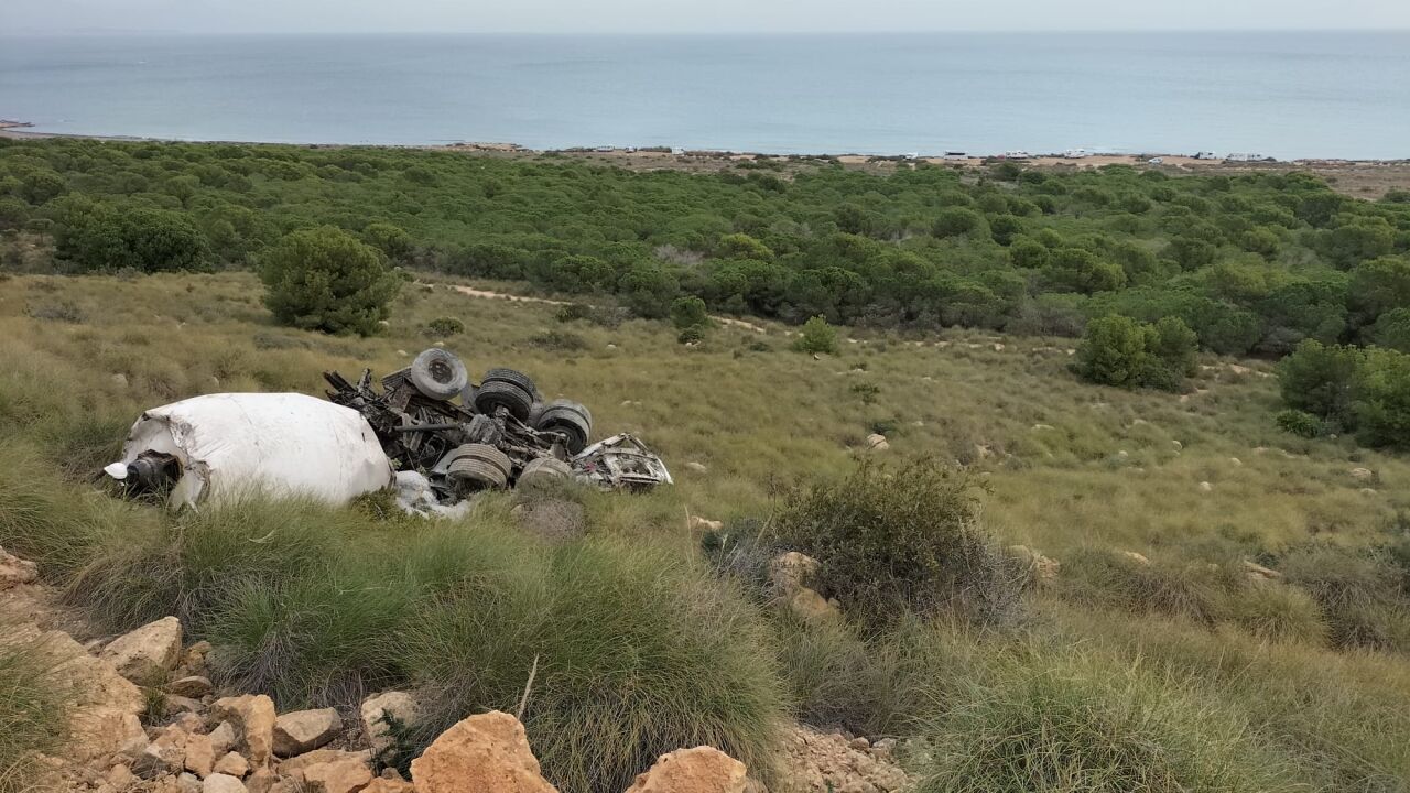 El Ayuntamiento de Santa Pola trabaja en la tramitación de todo el proceso administrativo que derive en la retirada de un camión hormigonera que el pasado mes de febrero se despeñó en la zona costera de Cabo desde lo alto del mismo. En un incidente en el que afortunadamente no se tuvo que lamentar daños personales, el vehículo pesado se precipitó desde la zona del entorno de Gran Alacant cayendo más de cien metros de altura hasta la zona de costa del área del Cabo.