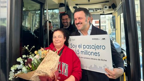 María Luisa Argente. Así se llama la afortunada usuaria número 15 millones del servicio de autobús urbano de Elche en este año 2025. Es viajera desde la pedanía de Torrellano y allí ha sido sorprendida, recibiendo de mano del alcalde de Elche, Pablo Ruz (PP), un ramo de flores y conociendo que, como premio a su fidelidad al servicio de transporte público, va a ser obsequiada con la gratuidad del autobús durante un año.