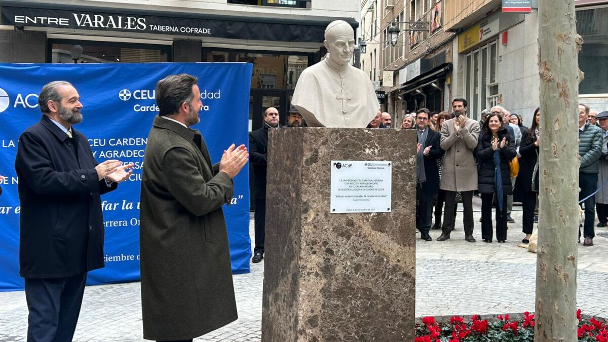 El presidente de la Fundación Universitaria San Pablo CEU se ha expresado en esos términos antes de asistir al acto de descubrimiento del busto dedicado al Cardenal Herrera Oria que, en conmemoración del 30 aniversario de la llegada del CEU a Elche, ha quedado ubicado en la Replaçeta de Les Barques, muy cerca de la sede original de la universidad en el centro de la ciudad, que es la que está en la calle Carmelitas.
