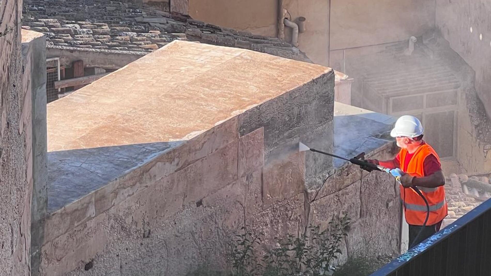 Gracias a esta acción se puede desincrustar la suciedad y borrar pintadas, ahorrando hasta el 75% del agua y un 23% de la energía. La maquinaria empleada tiene un rango de trabajo de presión de entre 200 y 500 bares y una temperatura máxima de 180 grados.