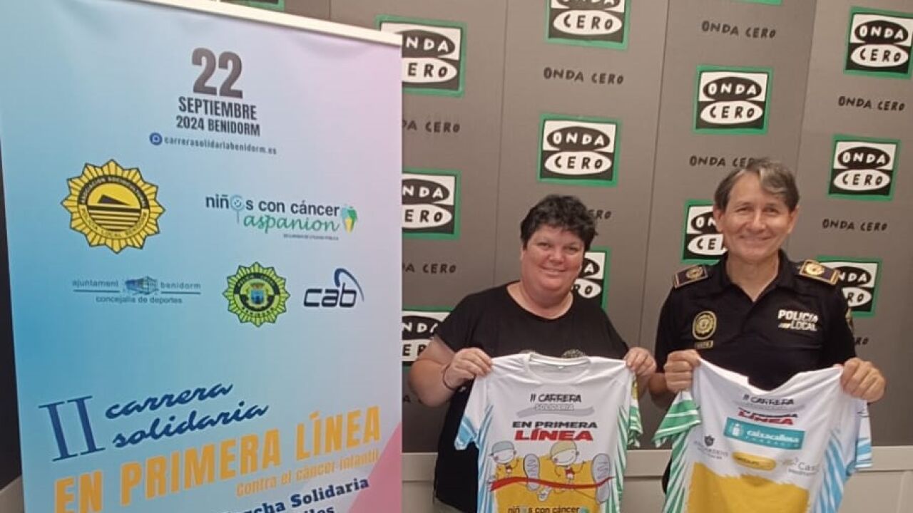Manolo Villalón y Mª José, representantes de la Asociación Cultural de la Policía Local de Benidorm y Aspanion respectivamente, han explicado todos los detalles de la segunda edición de la Carrera Solidaria "En 1ª Línea2 contra el Cáncer Infantil. Una cita deportiva en la que habrá carrera de 10k y 5 k además de Marcha Popular y Carreras Infantiles. las inscripciones ya están abiertas a través de la web carrerasolidariabenidorm.es