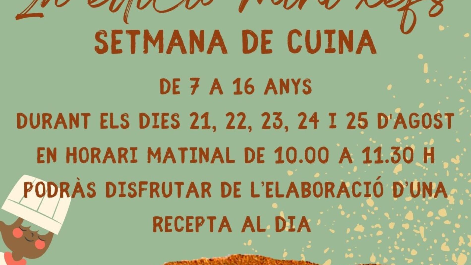 Los talleres culinarios se desarrollarán en la tercera semana de agosto, del21 al 25 de agosto, en el Aula Municipal de Cuina, ubicada en las instalaciones de la Formación Permanente de Adultos. La Setmana de Cuina se desarrollará en horario de 10:00 a 11:30h